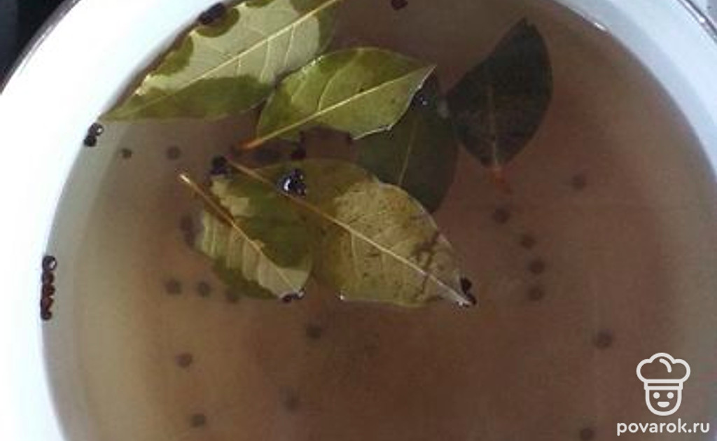 Делаем рассол. В кастрюлю наливаем 2 литра воды, соль, сахар и перец и лавровый лист. Доводим до кипения.