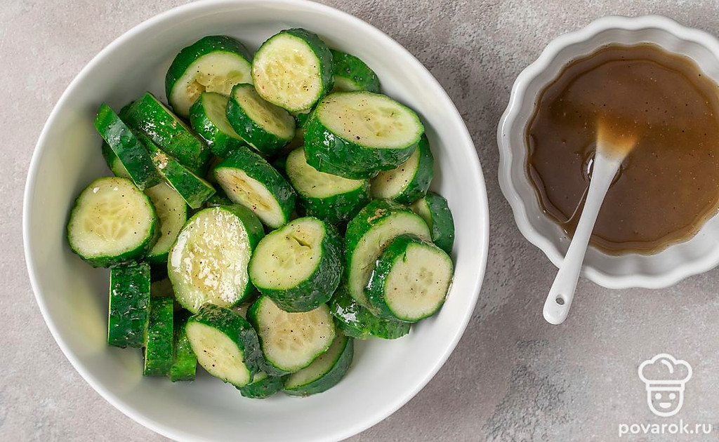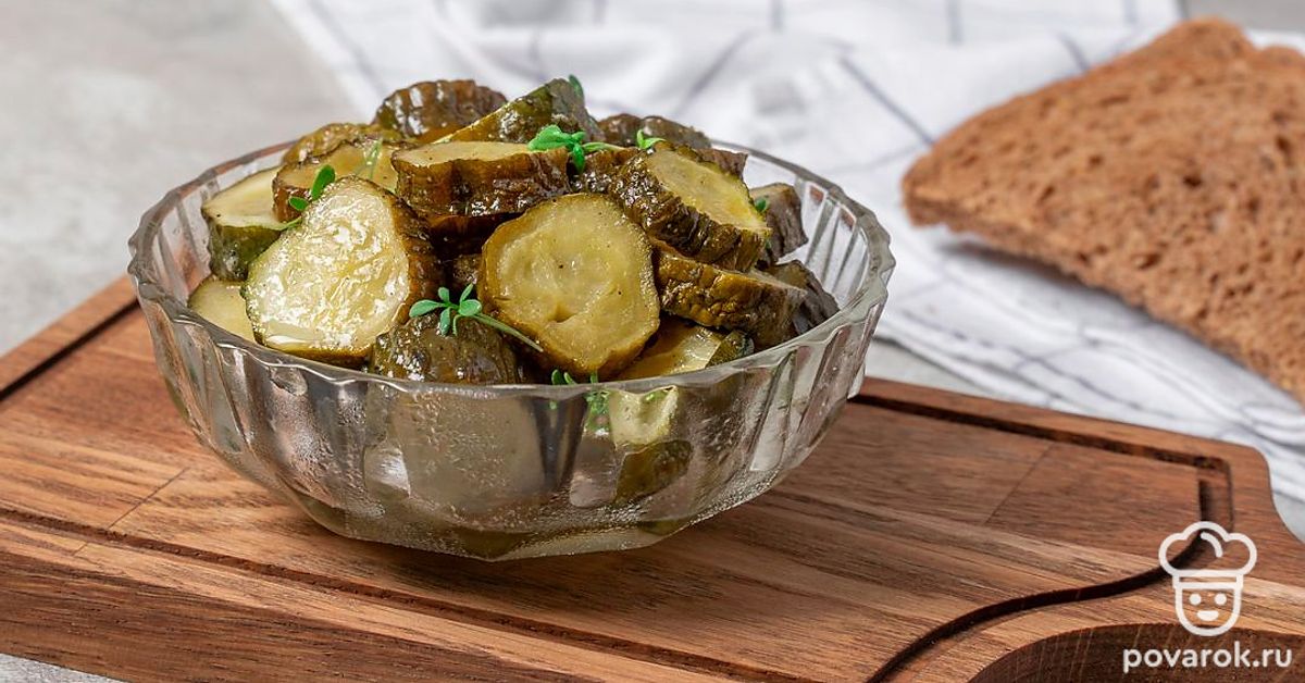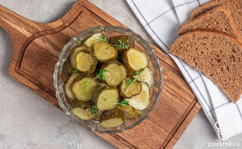 Начните делать заготовку. Огурцы порежьте кружочками и залейте горчичной заправкой. Дайте помариноваться 3 часа. После чего разлейте по банкам, закройте крышками и 20 минут простерилизуйте в кипящей воде.