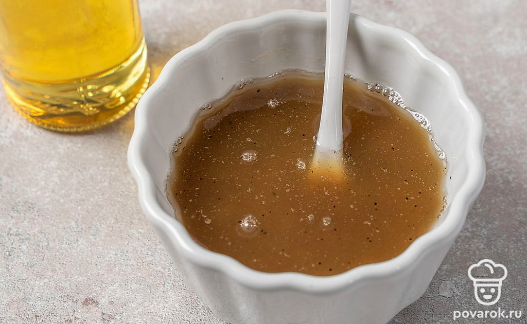 Приготовьте горчичный соус. Смешайте горчицу, сахар, соль и перец. Залейте их маслом и уксусом. Хорошо перемешайте.