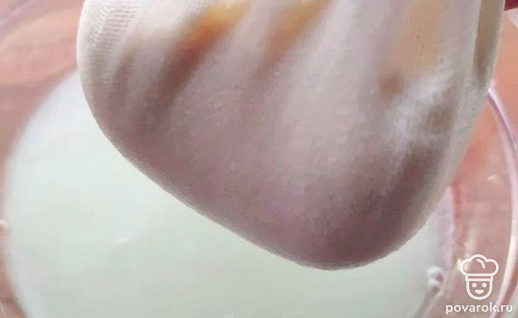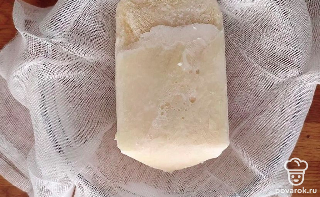Заморозьте ряженку прямо в заводской упаковке. Я предпочитаю это делать на ночь, но будет достаточно около шести часов. Затем удалите упаковку и откиньте ряженку на дуршлаг, покрытый чистой марлей.