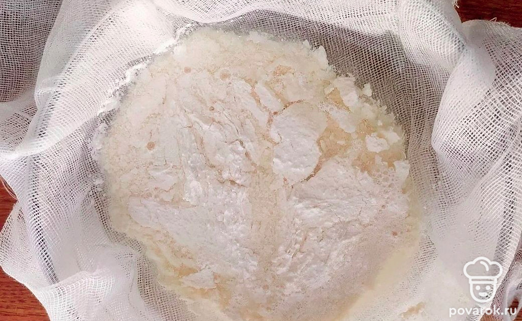 Соберите марлю, а сыворотку вылейте. Ее можно использовать для блинов или оладьев.