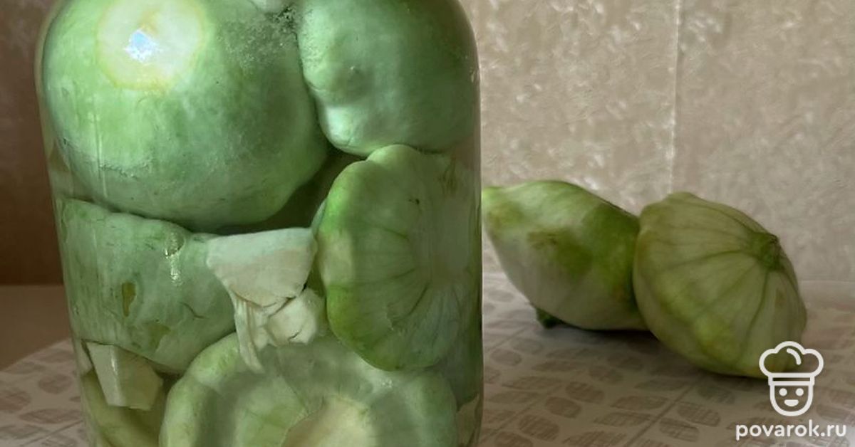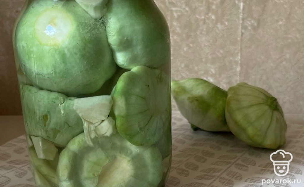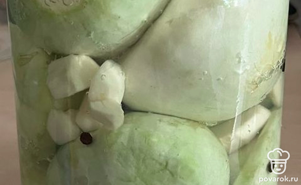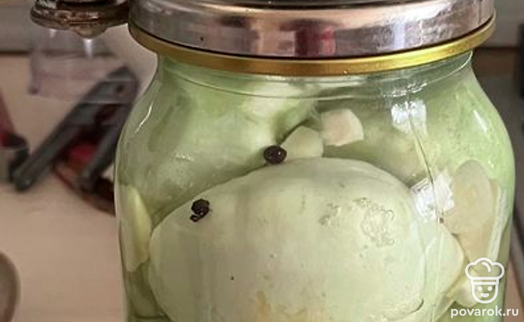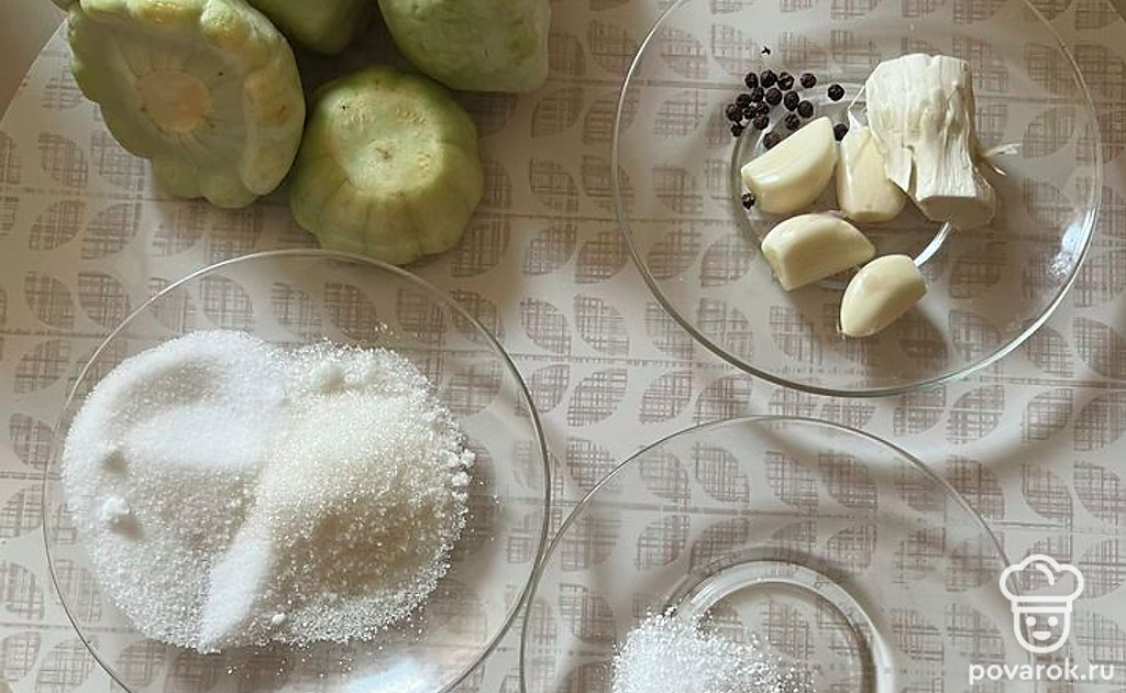Выложите в банку нарезанный корень хрена, чеснок, перец горошком и плотно уложите патиссоны. Залейте кипятком и оставьте на 15 минут.