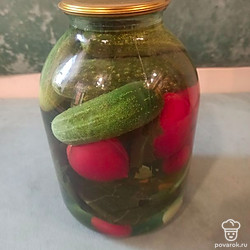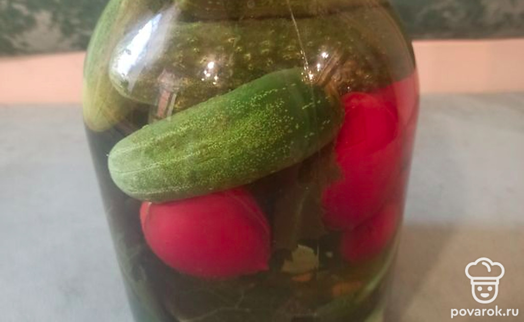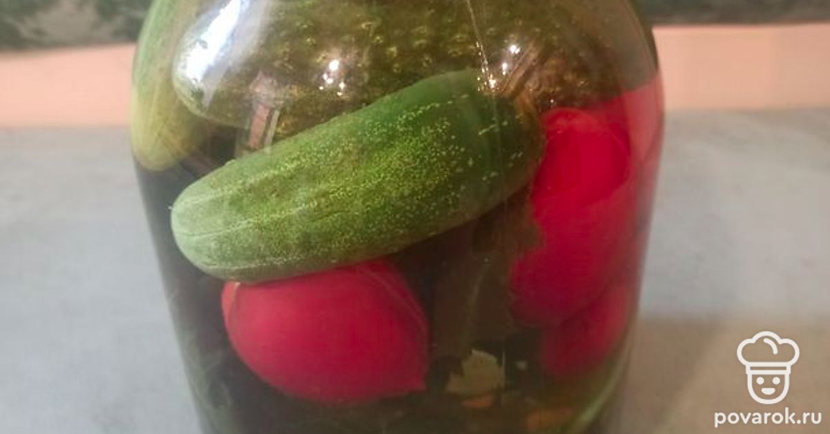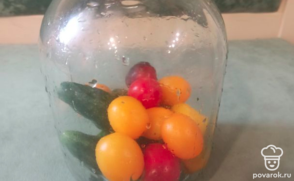 Вымыть огурцы и помидоры, выложить в чистую банку.