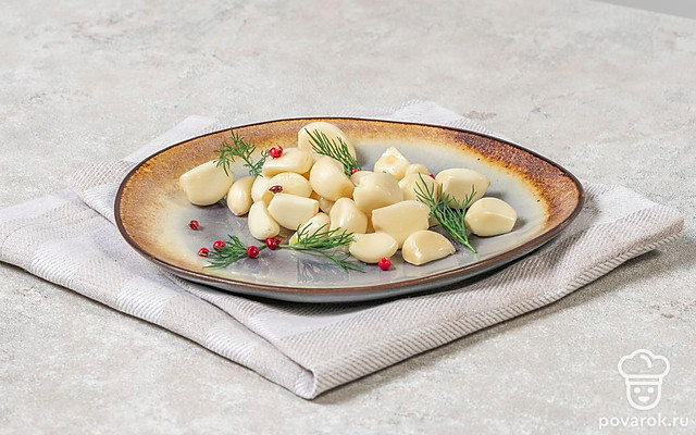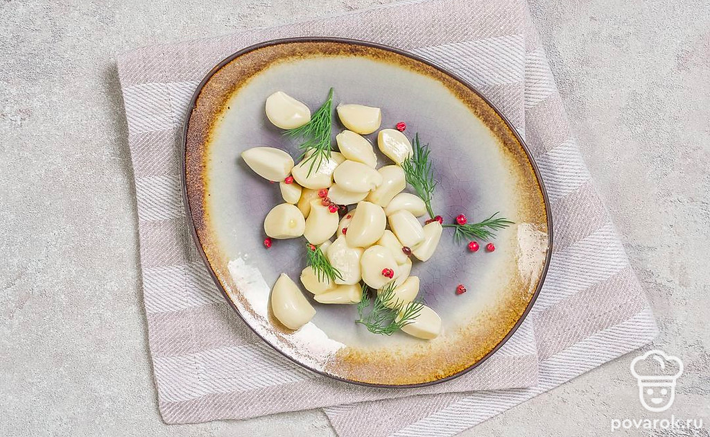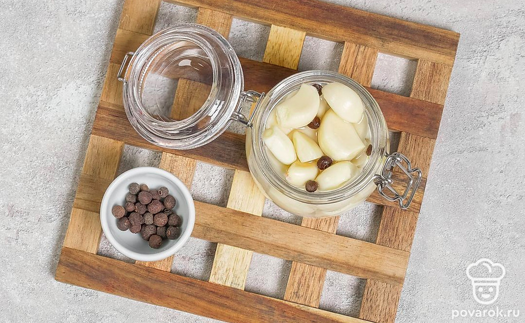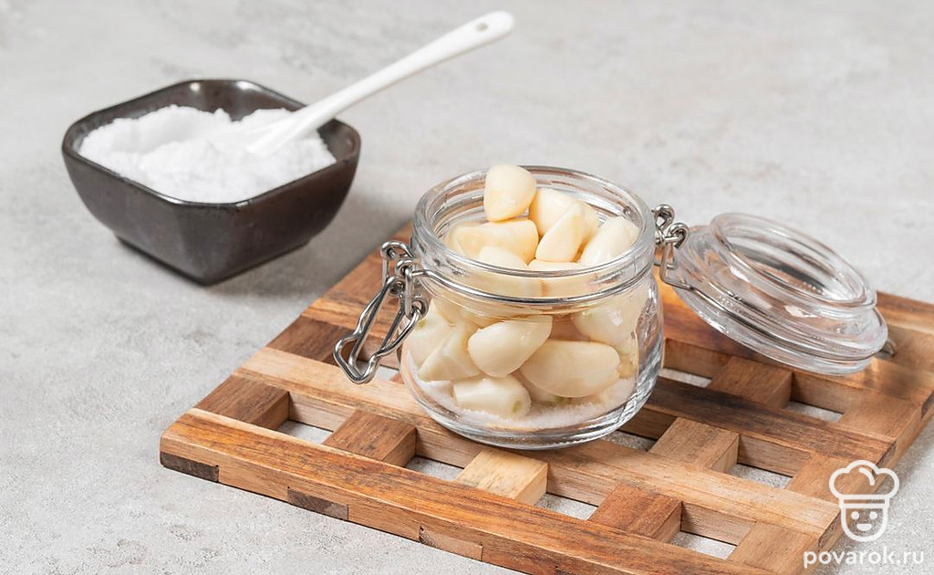 Малосольный чеснок можно использовать так же, как и свежий, добавляя его в соусы, супы, борщи, маринады и другие блюда. При этом готовится он очень просто, нужно учесть только несколько нюансов. Соль обязательно берите крупную, не йодированную. Помимо горошин душистого черного перца в рассол можно добавить лавровый лист, острый перец чили, гвоздику, зелень укропа или петрушки, смесь перцев в горошинах. За время засолки зубчики чеснока впитают в себя рассол и незначительно увеличатся в размере.