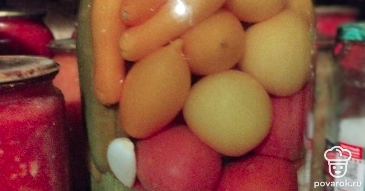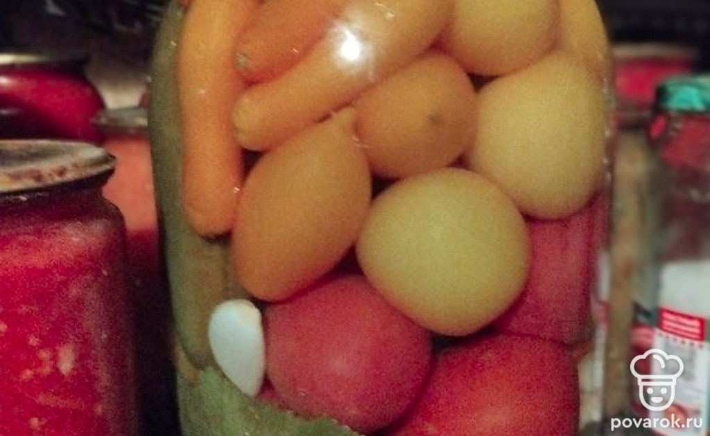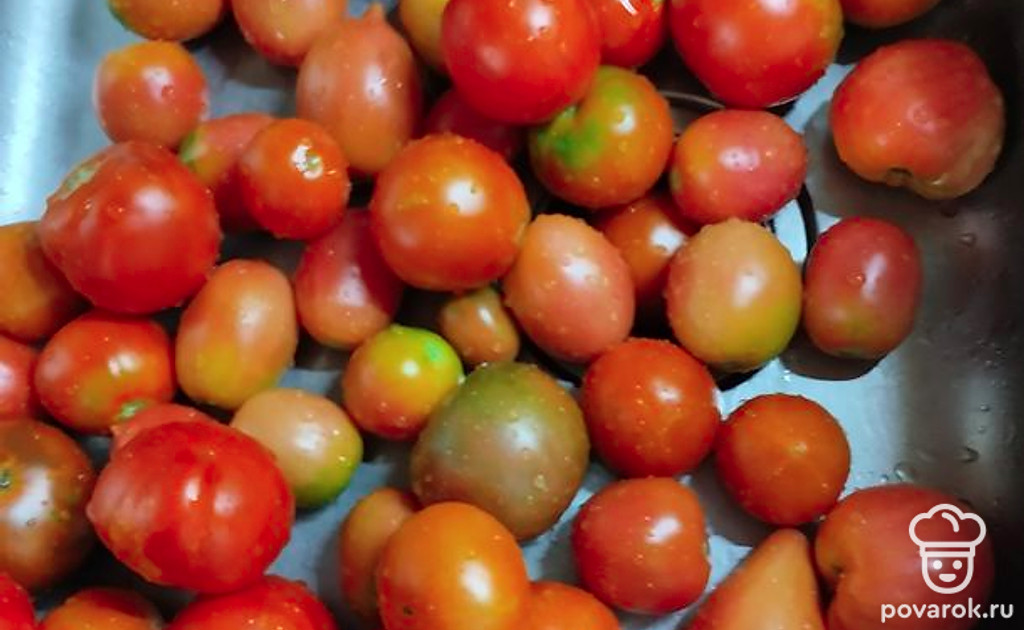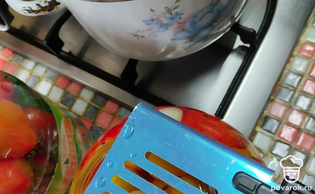 Сверху добавить помидорчики черри. Одновременно на плите вскипятить воду для рассола. Когда банки до конца заполнены, залить их аккуратно кипятком на 15 минут.
