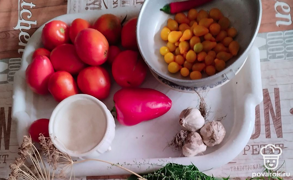 Помидоры (у меня свои, домашние) перебрать и хорошо помыть. Также подготовить болгарский и острый перец.
