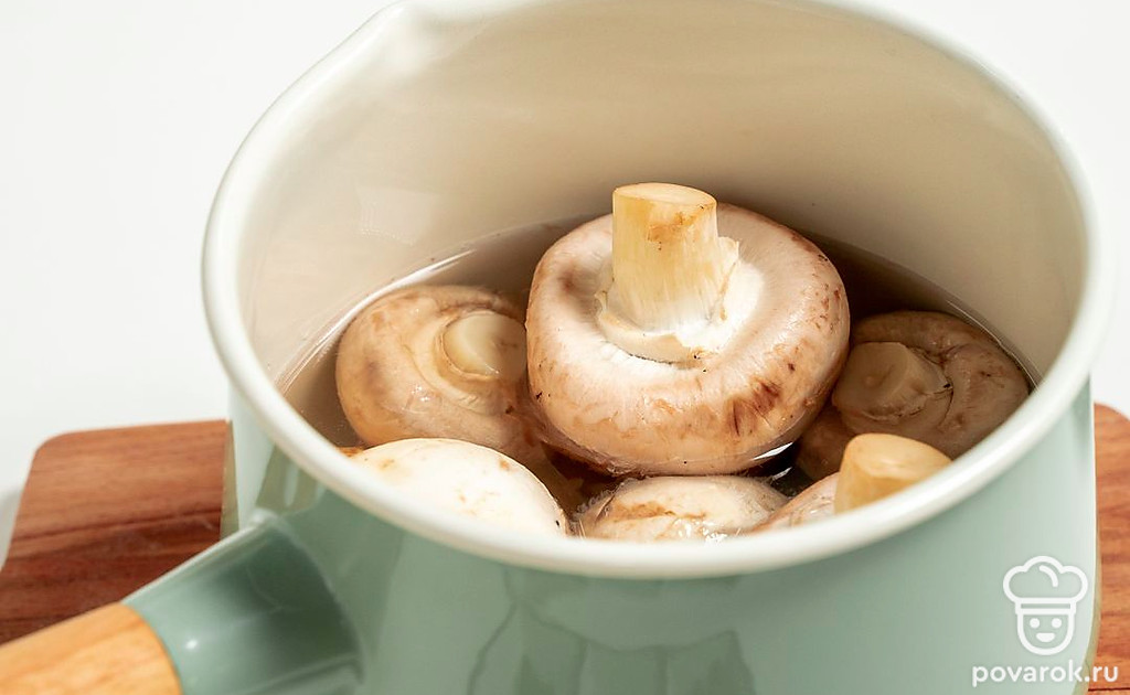 Отварите шампиньоны. В кастрюлю выложите шампиньоны, залейте 500 мл воды, вскипятите и варите на слабом огне 7 минут. Затем откиньте грибы на дуршлаг.