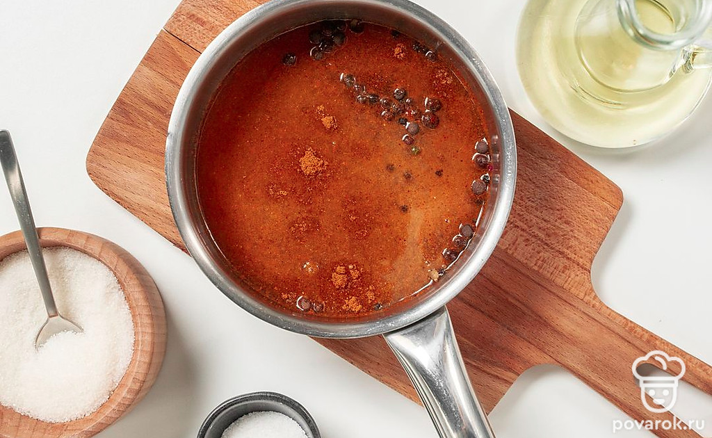 Приготовьте маринад. В другую кастрюлю налейте 500 мл воды, всыпьте все виды перца, сахар, соль и кориандр, добавьте чеснок, доведите до кипения и варите на медленном огне 3 минуты. Остудите маринад, добавьте в него уксус и подсолнечное масло, перемешайте.