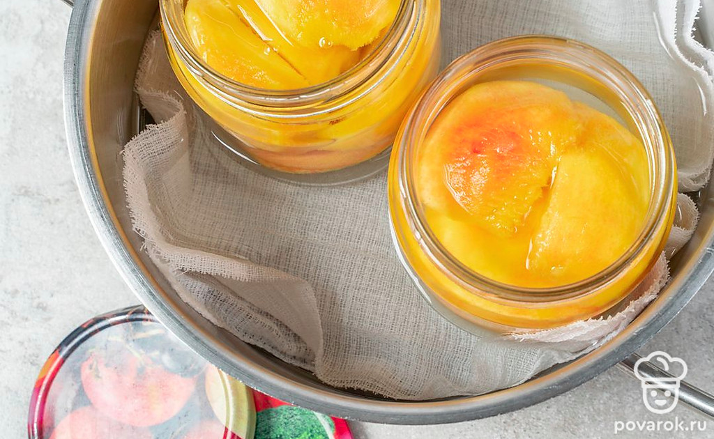 Законсервируйте фрукты. Для этого застелите подходящую по объему емкость тканью, установите подготовленные банки и пастеризуйте около 35 минут. Затем укупорьте, укутайте, остудите до комнатной температуры и отправьте на хранение.