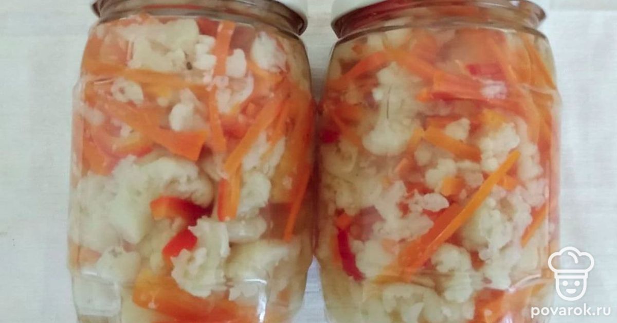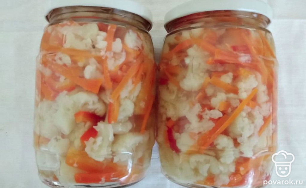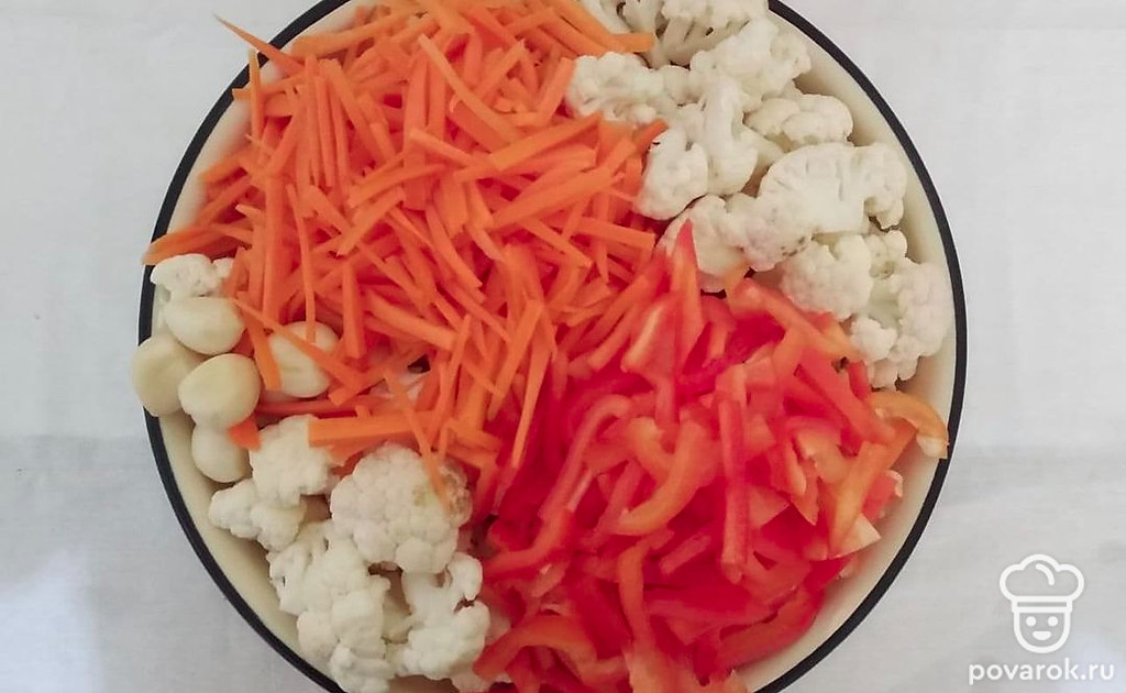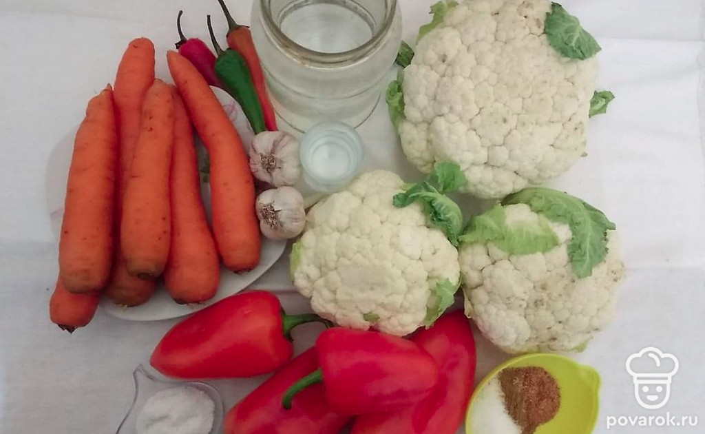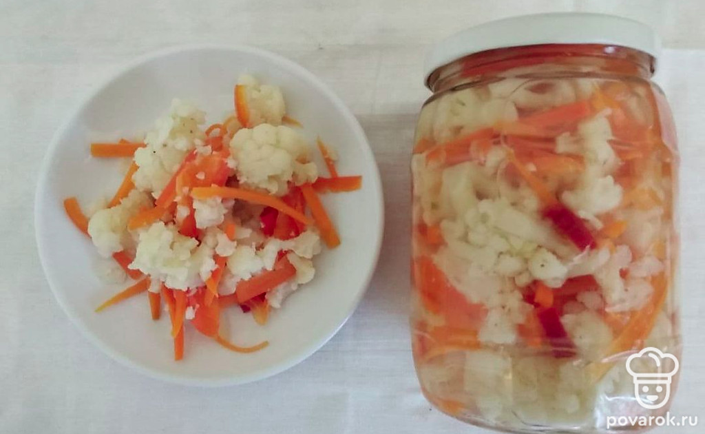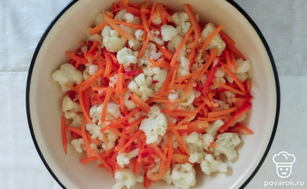 Цветная капуста по-корейски с морковью — интересное и приятное на вкус блюдо. Сочетание цветной капусты с морковью и болгарским перцем делает это блюдо немного кисленьким и пикантным на вкус. Также цветная капуста содержит много полезных веществ. Цветная капуста содержит большое количество веществ, обладающих противовоспалительными, антиканцерогенными свойствами, защищает от заболеваний сердечно-сосудистой системы, улучшает работу мозга и даже предотвращает набор веса.