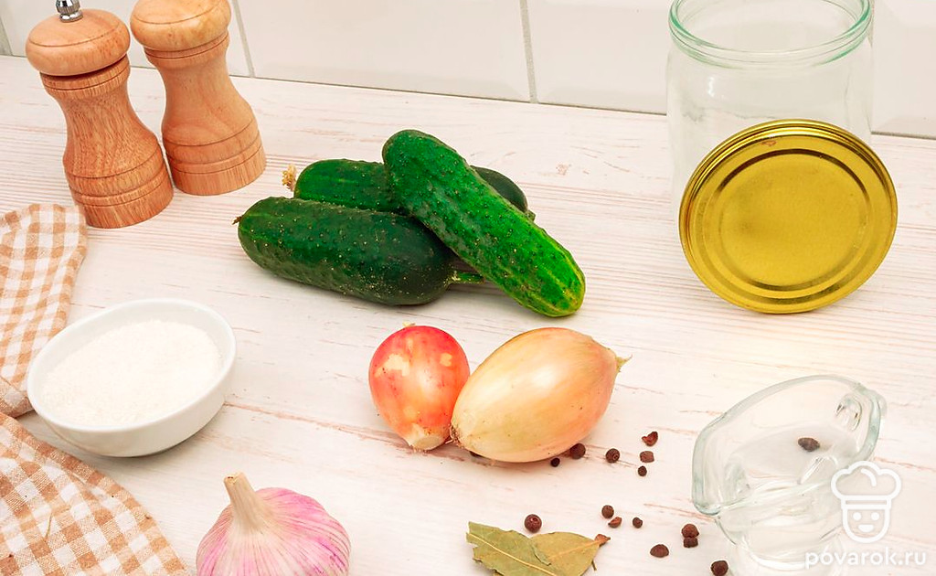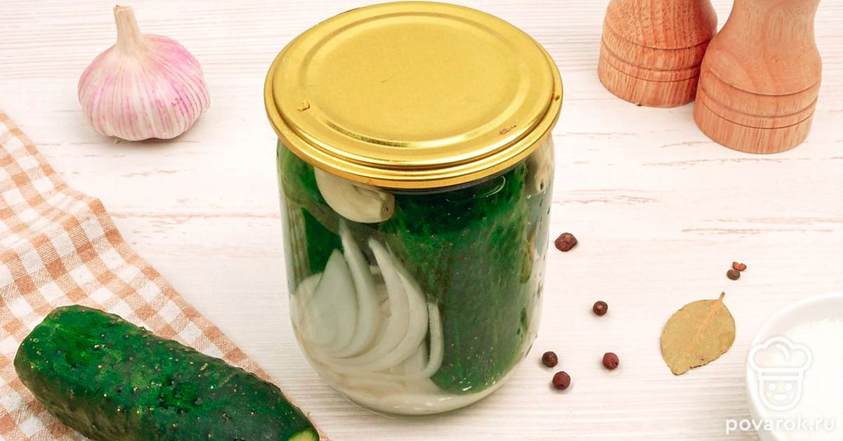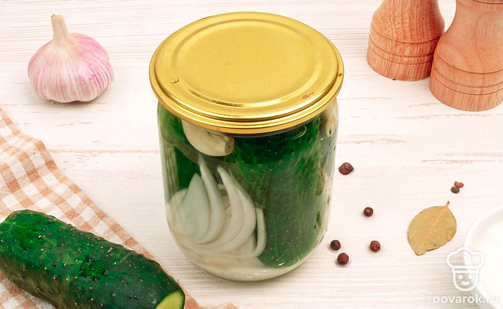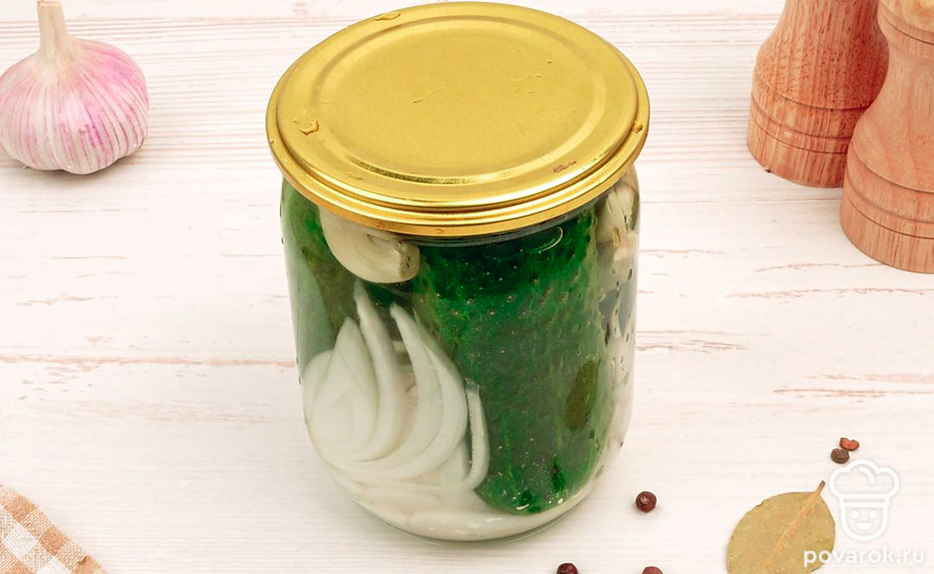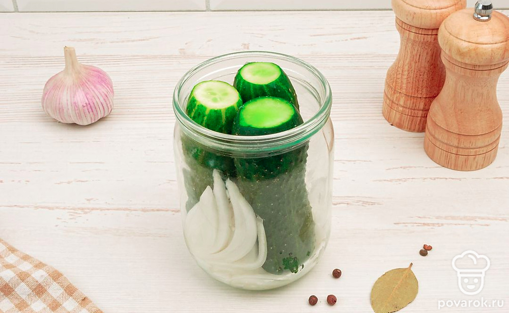 Срежьте с каждого огурца кончики. На дно банки положите лук, чеснок и затем огурцы и залейте горячим рассолом.