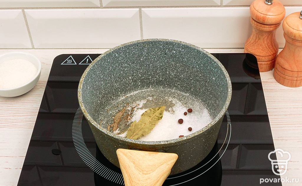 В кастрюле приготовьте рассол. Налейте стакан воды, добавив в него сахар, соль, перец и лавровый лист. Доведите до кипения.