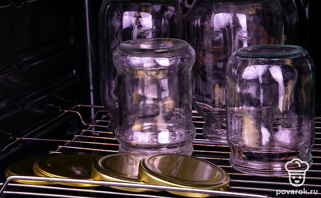 Простерилизуйте банки и крышки. Можно подержать их над паром, можно в течение 10 минут прогревать в духовке. После окончания процесса не вынимайте посуду из духового шкафа, чтобы она не мешала.