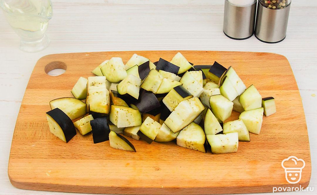 Порежьте баклажаны на кусочки толщиной 1,5-2 см. Они должны быть не крупные, но и не мелкие, чтобы не превратились в кашу.