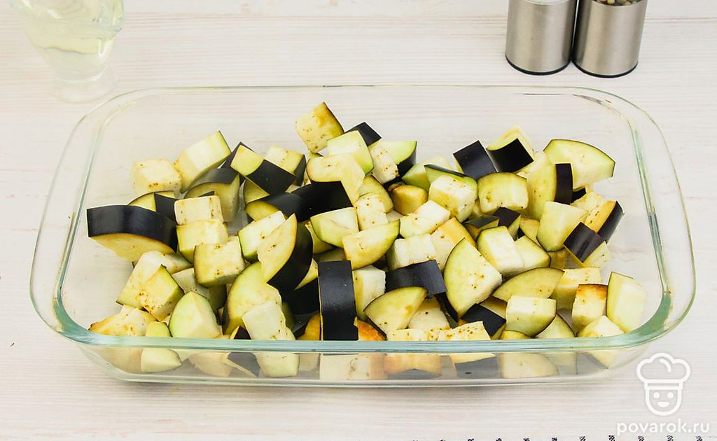 Нарезанные баклажаны переложите в открытую емкость (хорошо подойдет стеклянная форма для запекания), посолите (1 ч.л.) и оставьте на 1 час, чтобы ушла горечь. После этого промойте их и просушите, верните в форму для запекания, сбрызните маслом и отправьте в разогретую духовку на 15-20 минут.