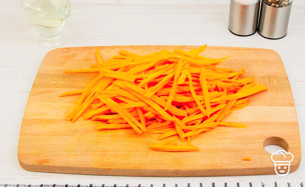 Морковь нарежьте тонкой соломкой - такая опция есть у кухонных комбайнов. Если его нет, можно натереть овощ в крупную терку.