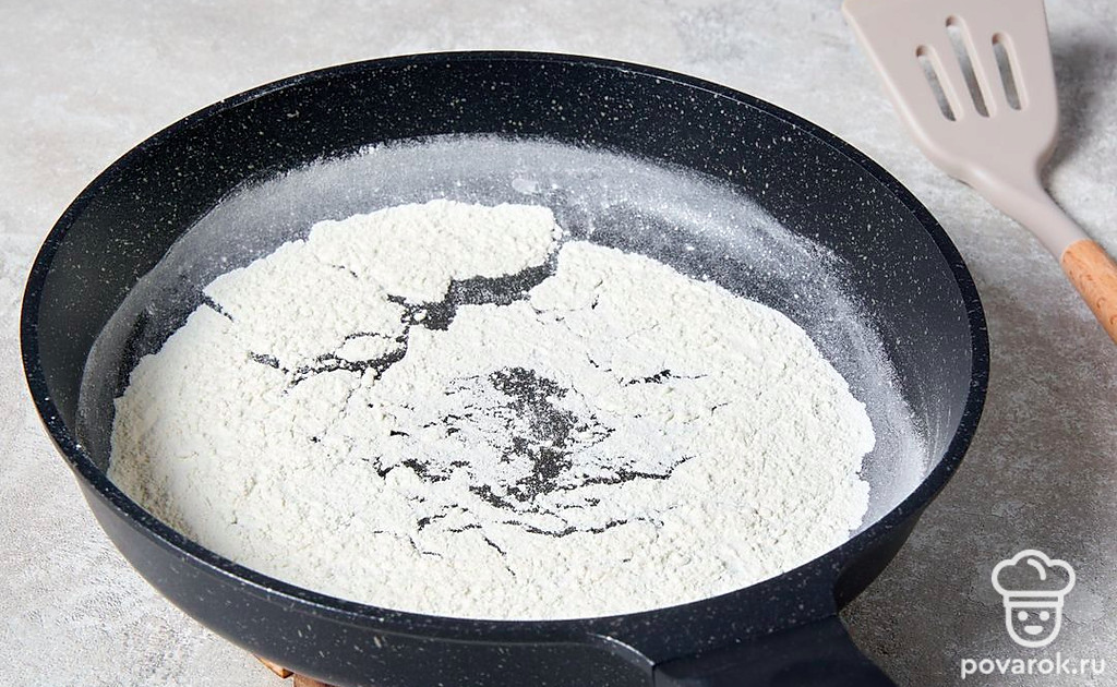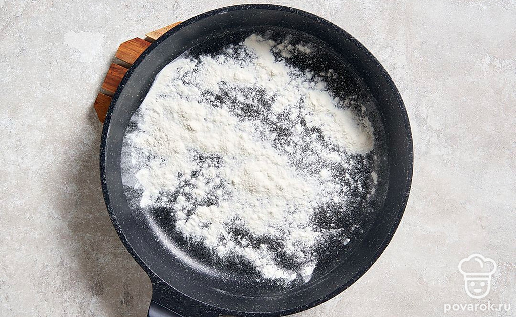 Поставьте сухую сковороду на огонь немного больше среднего, как следует ее разогрейте. Насыпьте на сковороду просеянную муку.