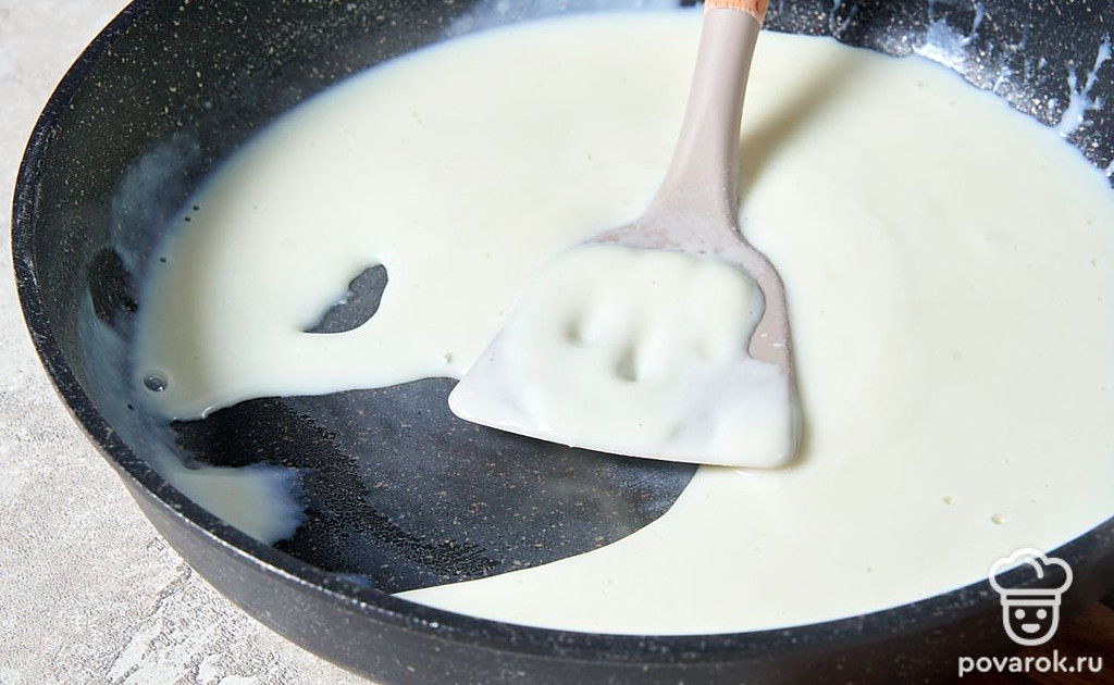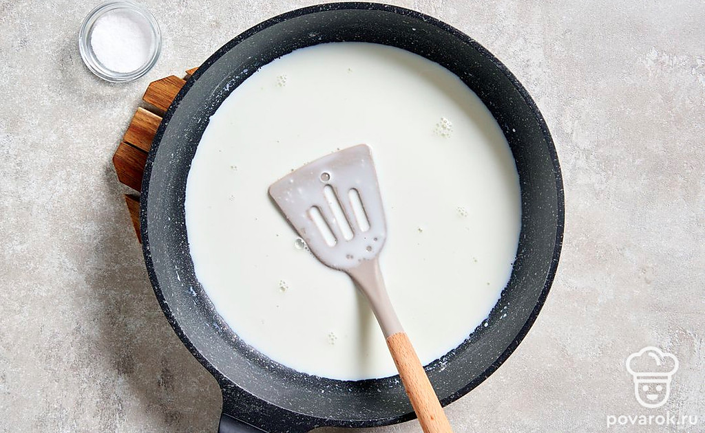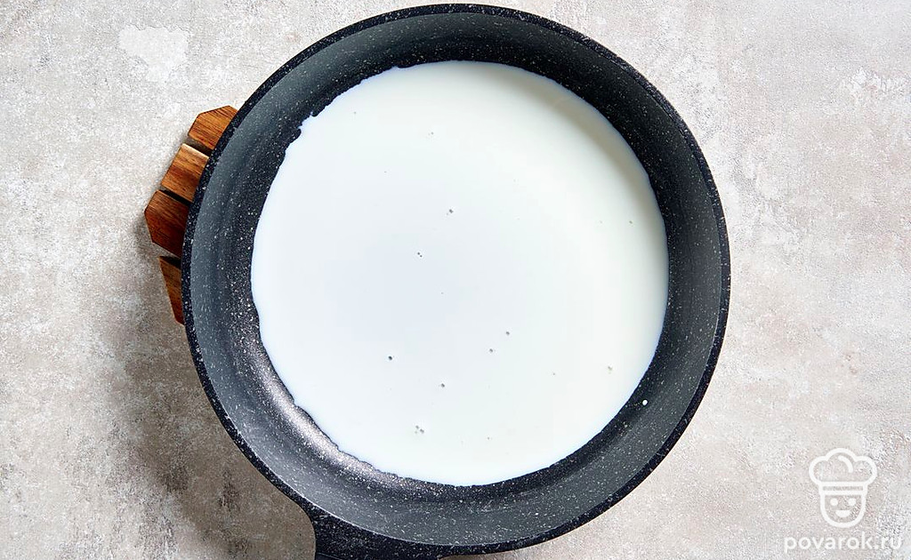 Налейте на сковороду 1/3 часть молока, слегка согрейте его на среднем огне.
