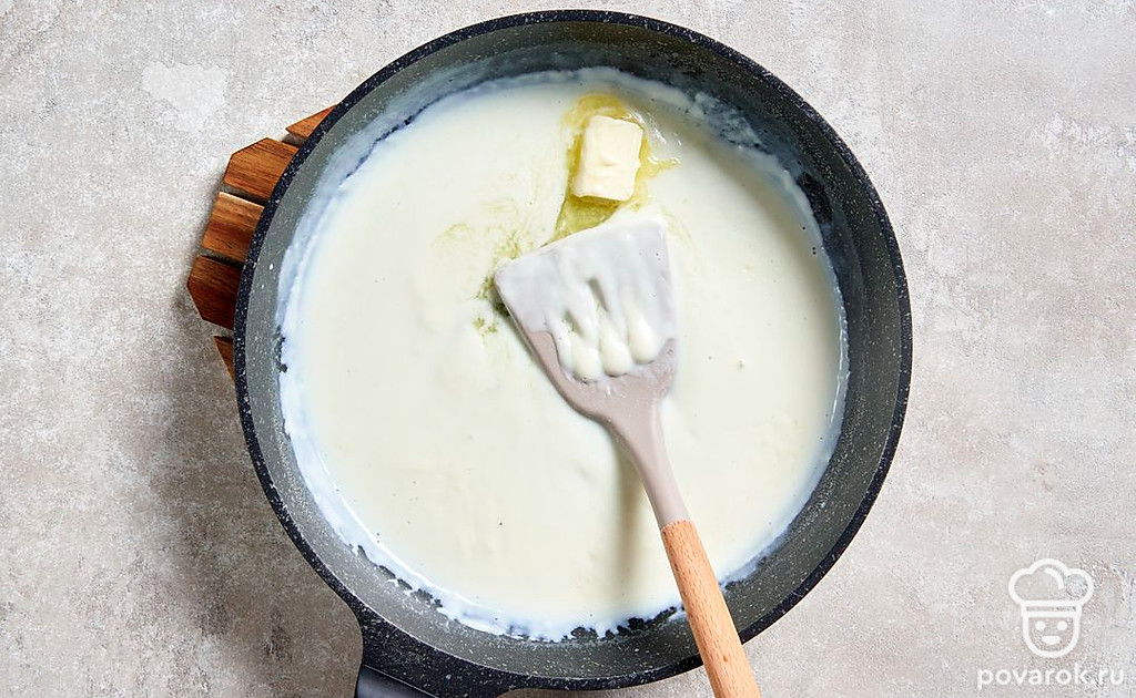 Нейтральный по вкусу и деликатный по текстуре молочный соус составом напоминает знаменитый бешамель, но получается не таким густым и готовится немного по-другому. По этому рецепту теплую муку нужно высыпать в молоко, а только после — добавить масло.