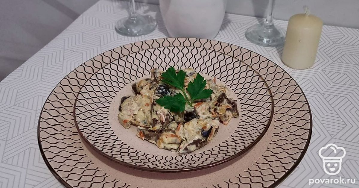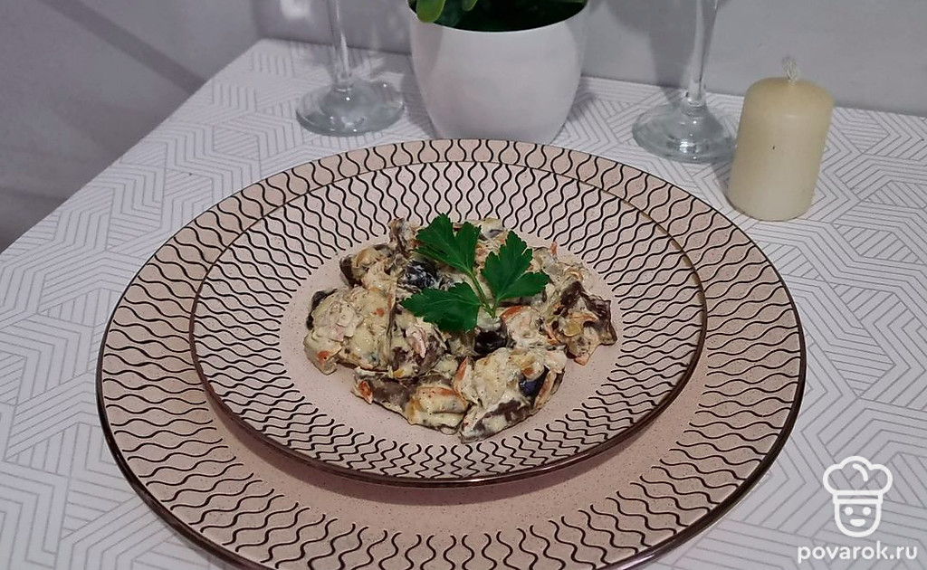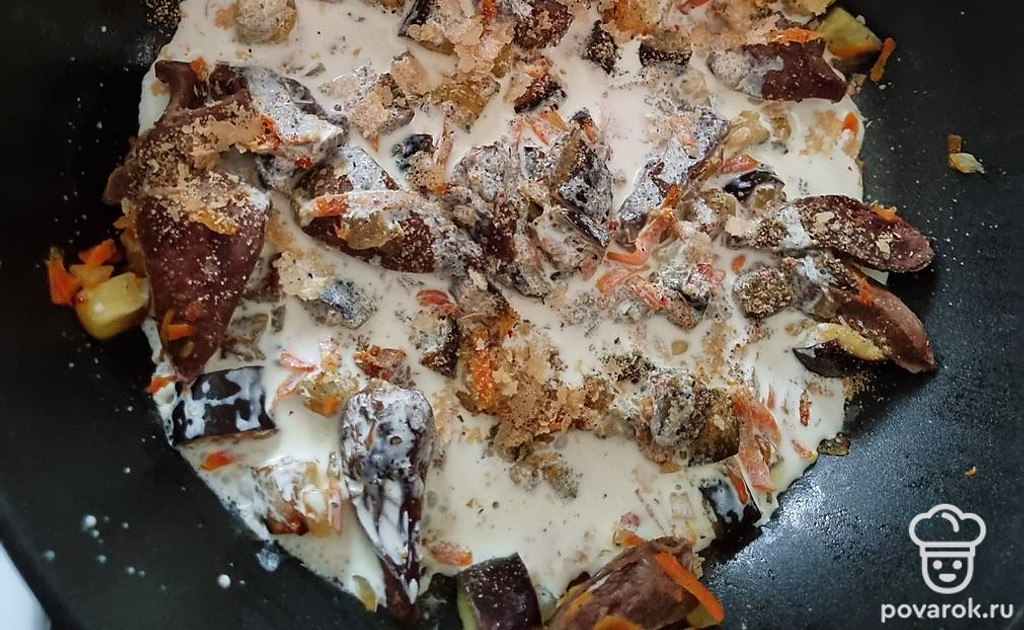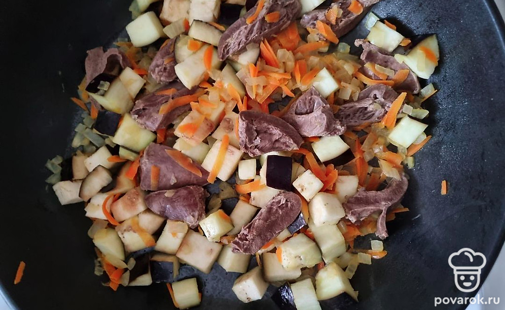 Баклажан нарезать крупными кубиками, добавить его на сковороду вместе с сердечками. Перемешать, тушить на медленном огне около 10 минут.