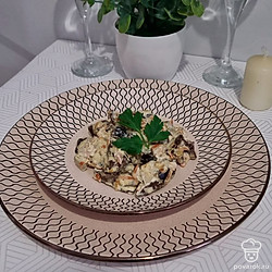 Добавить сливки, посолить, поперчить, добавить специи и перемешать. Довести до кипения. Выключить.