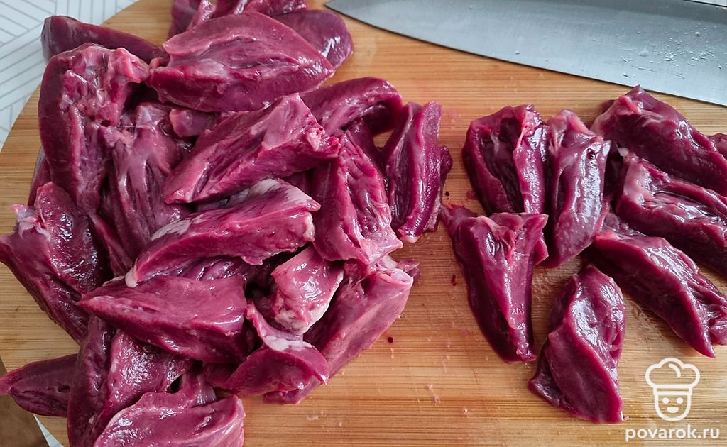 Сердечки помыть, нарезать крупно и отправить вариться. После закипания снять пену, убавить огонь на средний и варить около 25 минут.