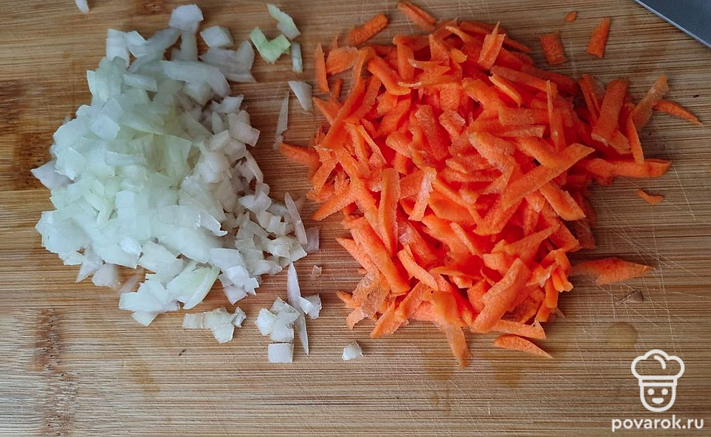 Морковь помыть, очистить и натереть на крупной тертке. Лук почистить и нарезать мелко.