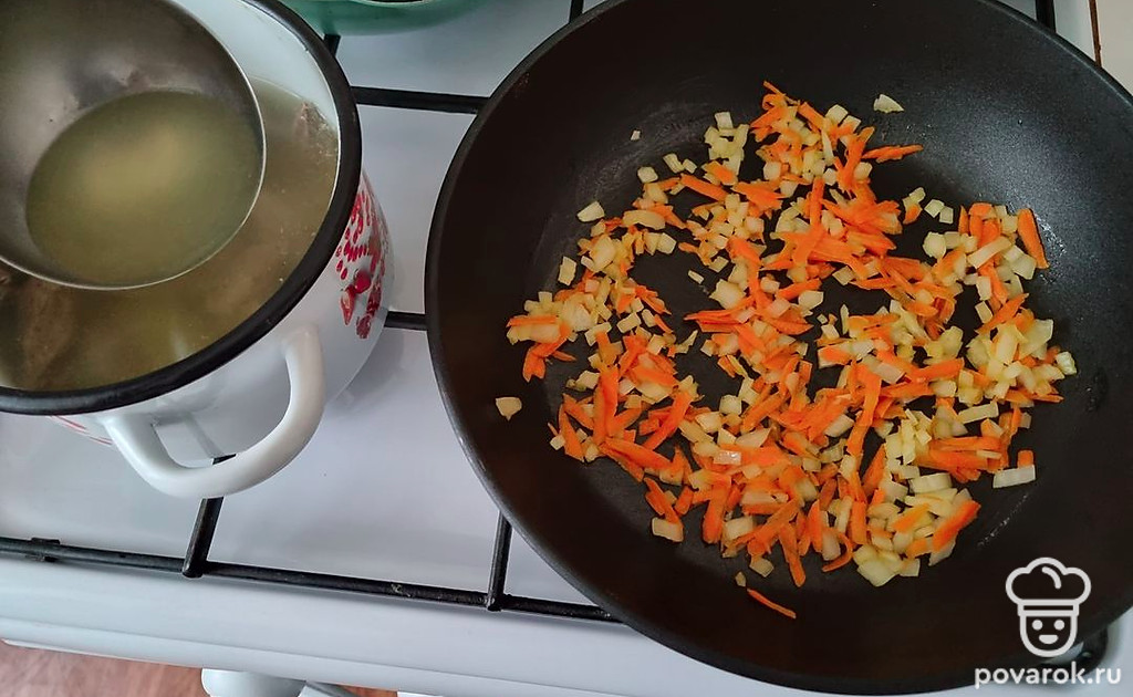 Разогреть сковороду с растительным маслом, слегка обжарить лук, добавить морковь, перемешать. После того, как морковь слегка обжарится, добавить один полковник бульона, в котором варились сердечки. Перемешать, тушить в течение 5 минут.
