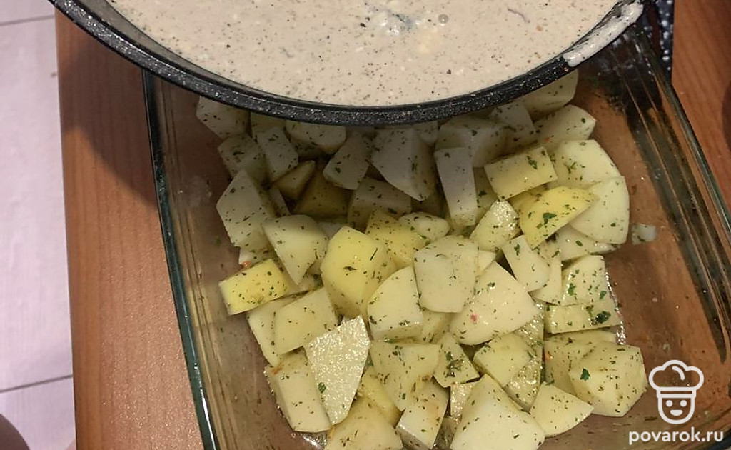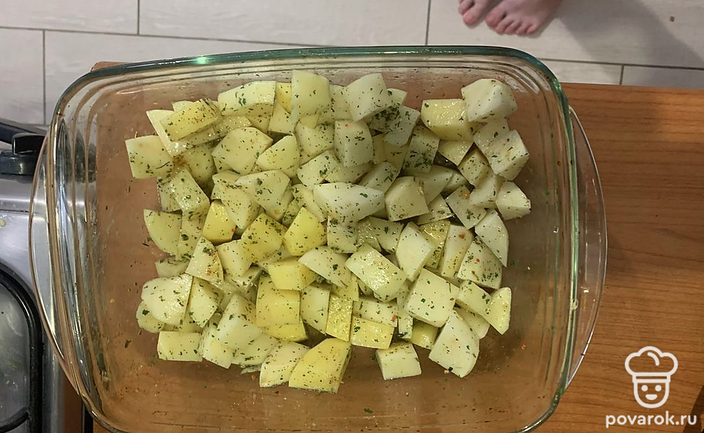 Хорошо помойте картофель, почистите и нарежьте на кубики. Сложите в форму для запекания. Смешайте с картофелем специи, масло и соль.
