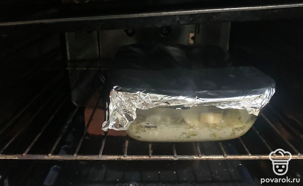 Сверху посыпьте тертым сыр и накройте форму фольгой. Отправьте в духовку до готовности картофеля.