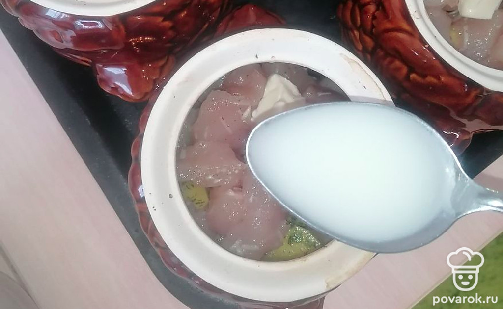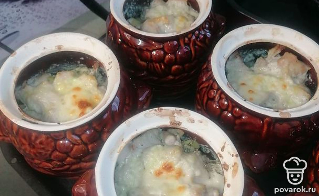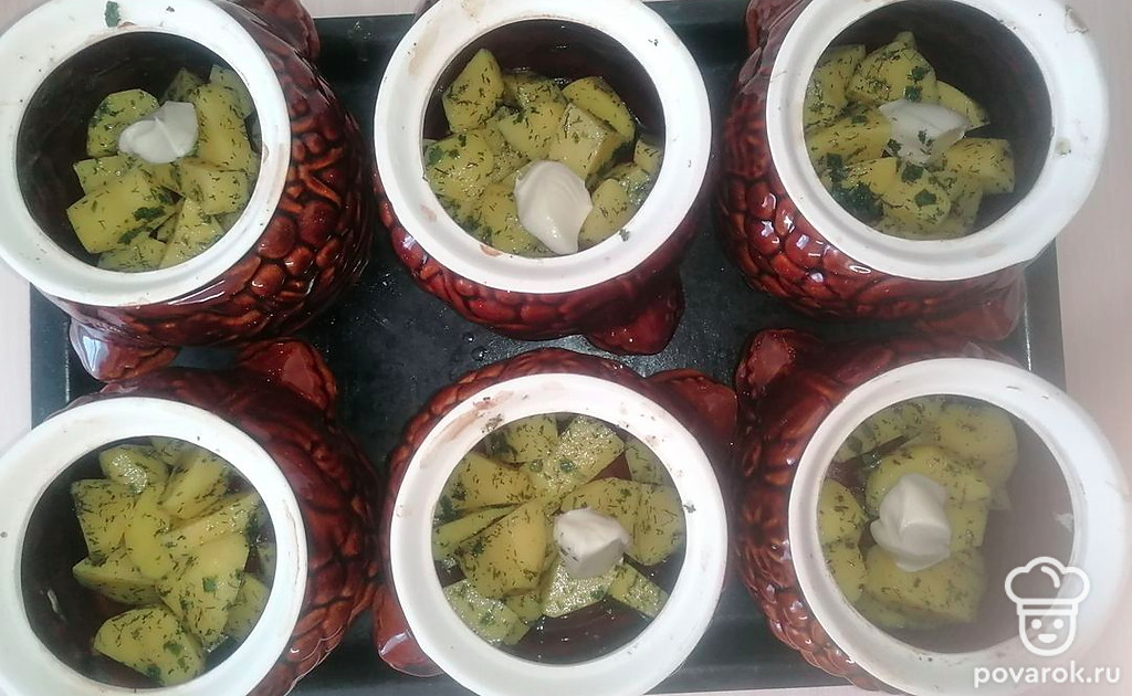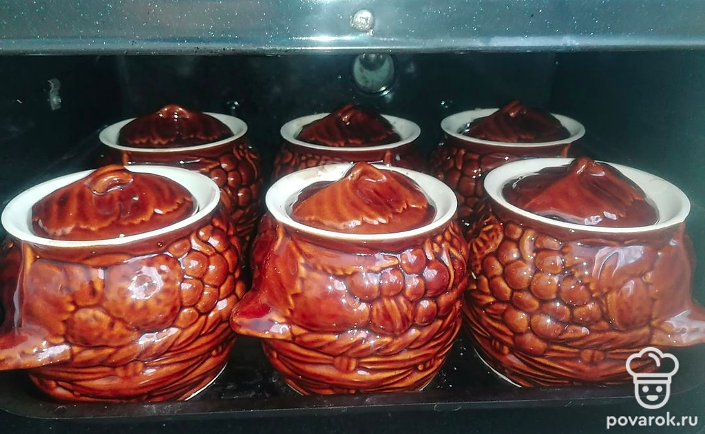 Закройте горшочки крышками и поставьте в разогретую до 250 градусов духовку на 50 минут.