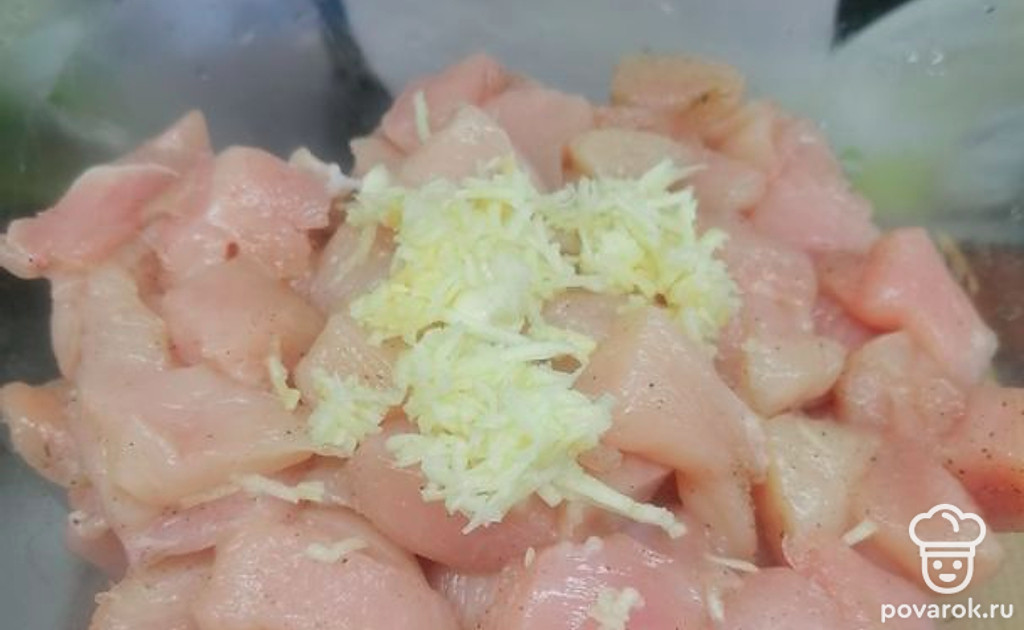 Нарежьте куриное филе такими же кусочками, как и картофель, добавьте любимые специи и хорошо перемешайте.