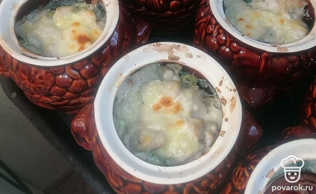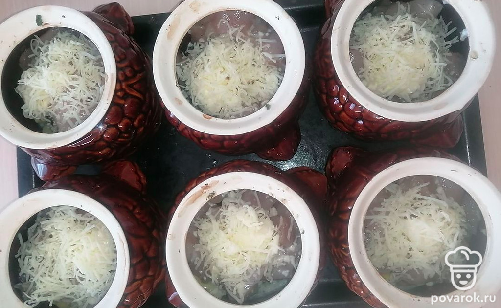 Распределите весь натертый сыр равномерно по всем горшочкам.