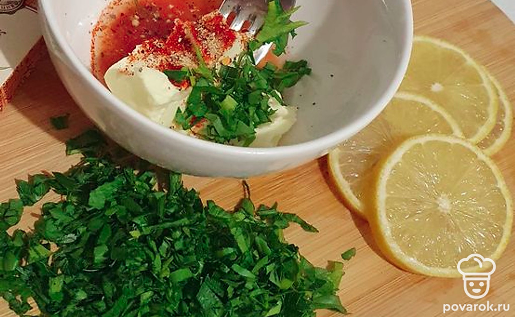 Приготовьте соус. Смешайте сливочное масло, паприку копчёную, сок одной части лимона, нарезанную петрушку и специи. Получившуюся смесь тщательно перемешайте.