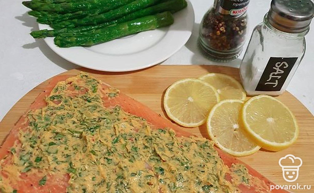 Распределите соус по всей поверхности рыбы. Положите форель вместе со спаржей на противень. Добавьте несколько круглых слайсов лимона.