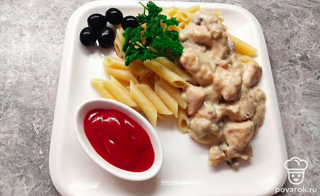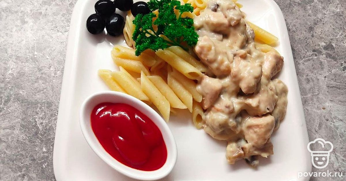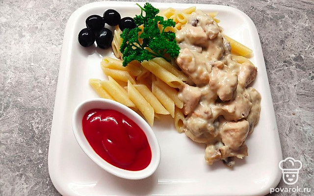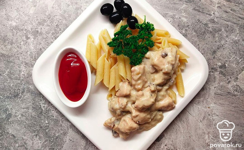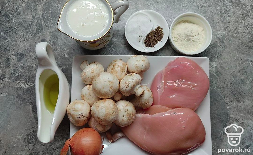 Сливочный соус как правило готовят на основе молока, сметаны или жирных сливок. Идеально такой соус гармонирует с пастой. Но если подать его с другим гарниром, то получится тоже очень вкусно. Для приготовления этого блюда можно использовать практически любые грибы. Яркий и концентрированный грибной вкус придадут белые грибы, но чаще этот соус готовят из шампиньонов. А вот в качестве мяса лучше использовать куриную грудку. Во-первых, приготовить ее по сравнению с другими видами мяса быстрее. Во-вторых, именно куриная грудка в сливочном соусе получается мягкой, нежной и сочной.