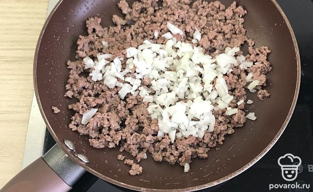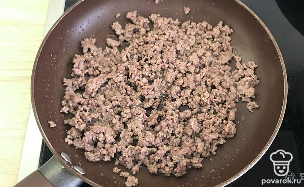 Фарш обжарить на растительном масле до выпаривания влаги, разбивая комки.