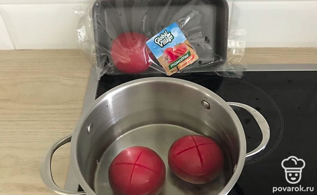 Помидоры надрезать крест-накрест и опустить в кипяток. Снять кожицу и нарезать мелко.