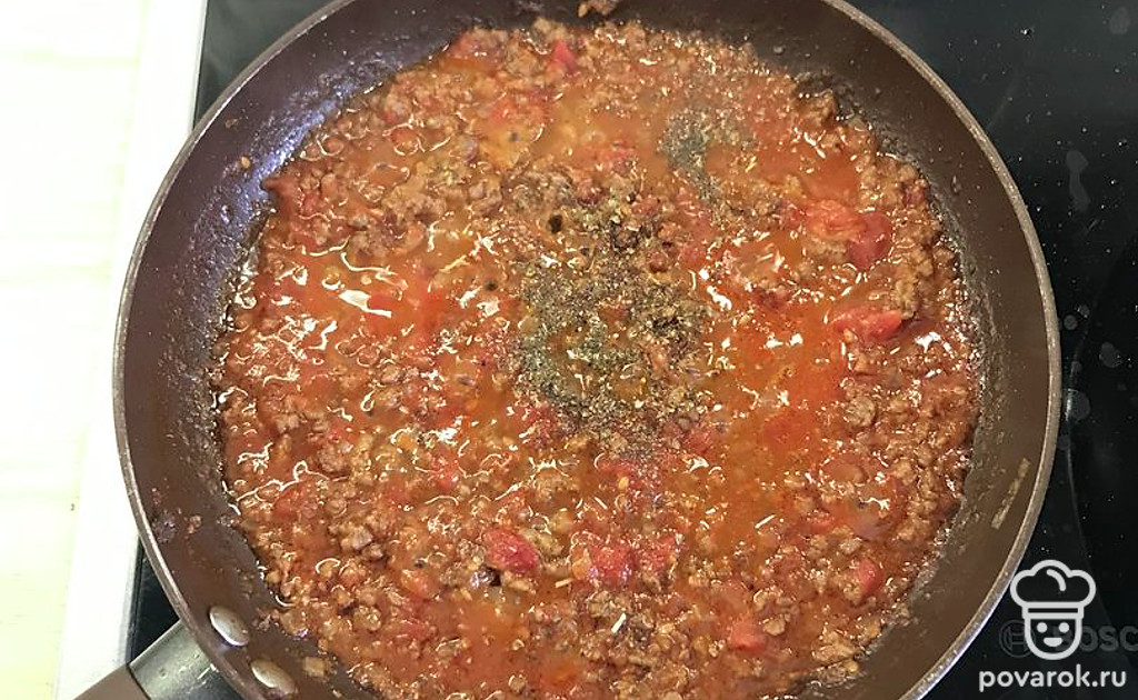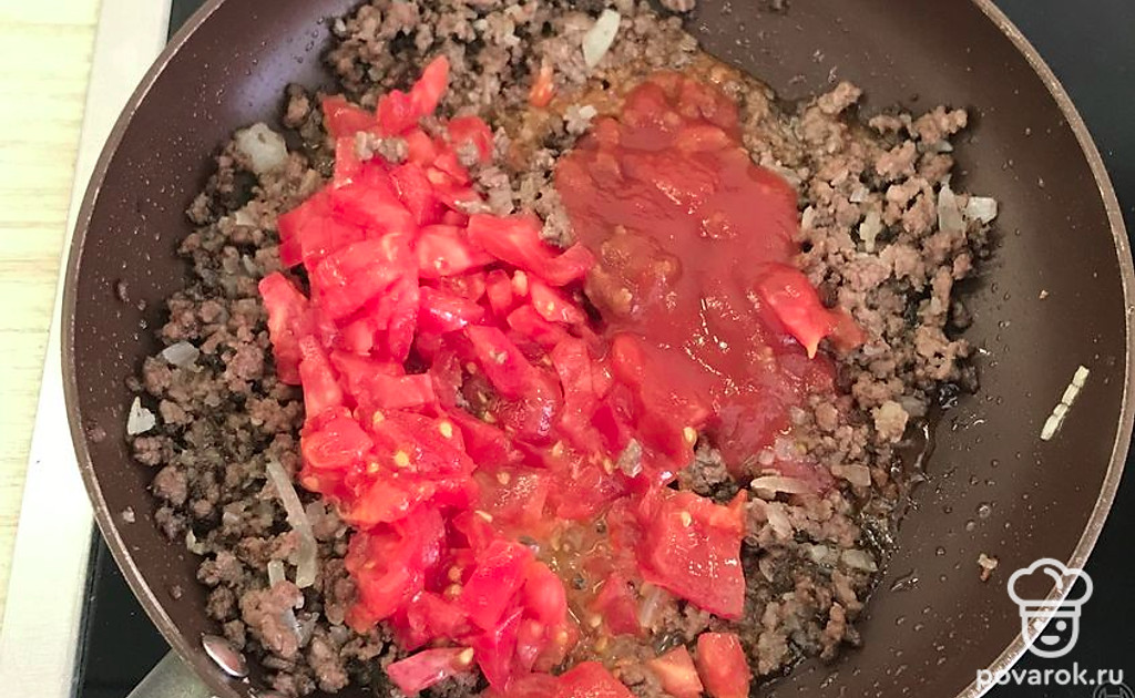 В обжаренный с луком фарш выложить помидоры и протертые томаты. Перемешать. Обжаривать 5 минут вместе, постоянно помешивая. Добавить воды. Убавить огонь и тушить над закрытой крышкой еще минут 20.
