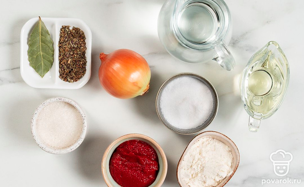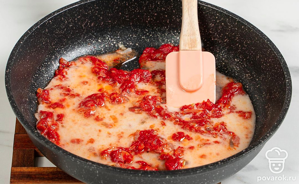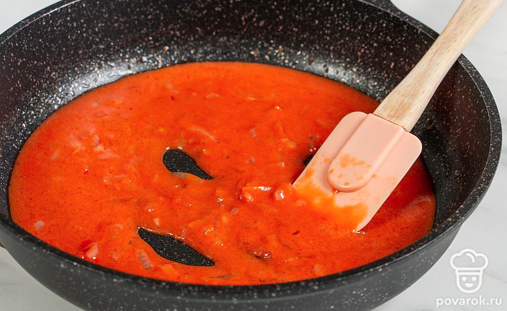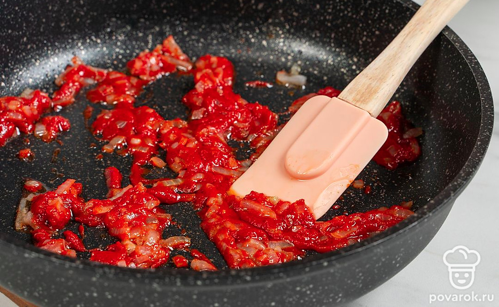 Вылейте мучную смесь в сковороду с луком и томатной пастой. Перемешайте соус.