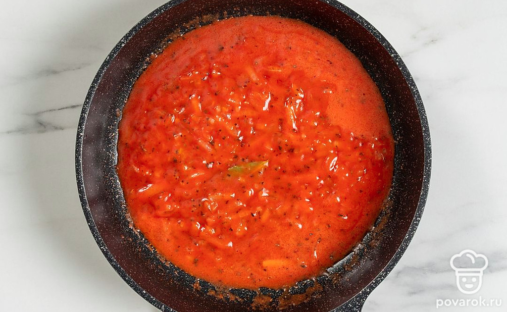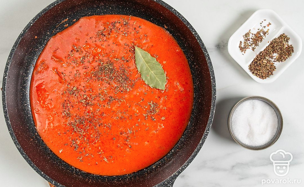 Добавьте в соус соль, сахар, базилик и лавровый лист. Перемешайте подливку.