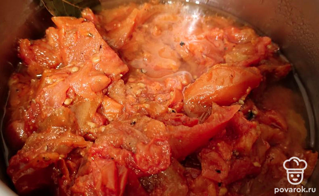 Помойте помидоры, удалите плодоножку и нарежьте. Вид нарезки — салатный. Я не снимаю кожицу с томатов для этого рецепта, поэтому лучше выбирать томаты с тонкой кожицей. Нарезанные томаты сложите в толстостенную кастрюлю и поставьте на средний огонь. Добавьте соль, перец, лавровый лист, 1 столовую ложку яблочного уксуса и варите 20-30 минут после закипания.