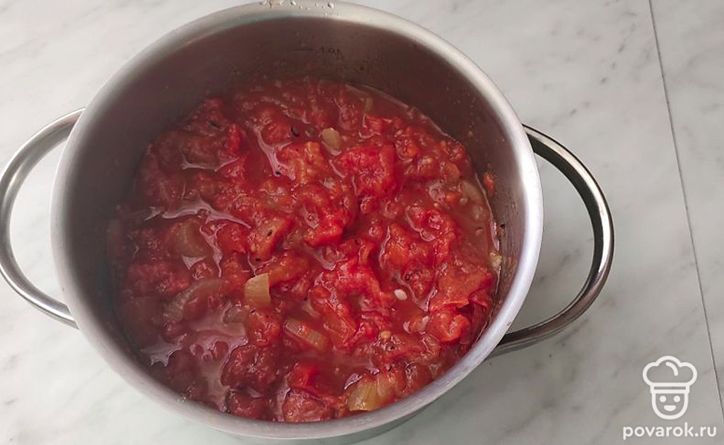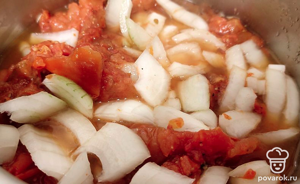 Нарежьте репчатый лук и добавьте к томатам. Варите еще 30 минут на среднем огне, затем снимите с плиты.