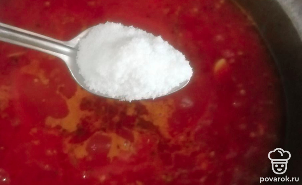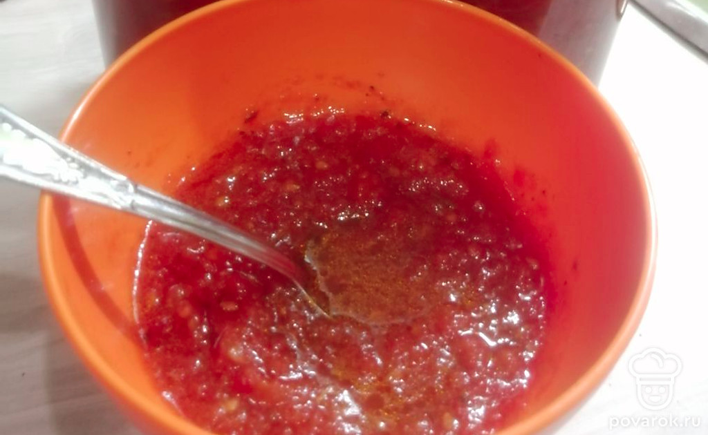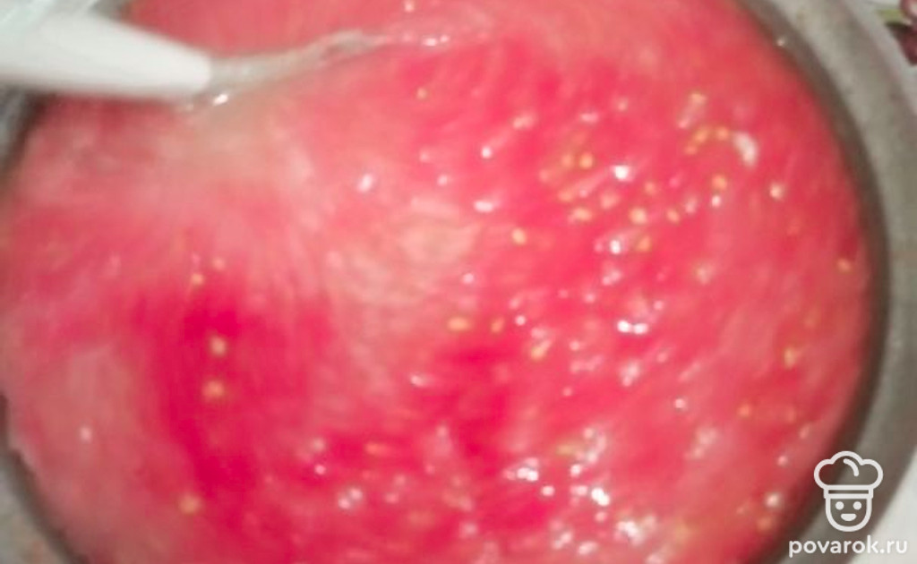 Прокрученные помидоры переливаем к чесноку в кастрюлю. Увариваем овощи часа три, чтобы смесь стала густой. Периодически помешиваем, чтобы не пригорело. Густота и время уваривания зависят от сорта помидор, поэтому ориентируемся по сорту овощей и вашим предпочтениям.