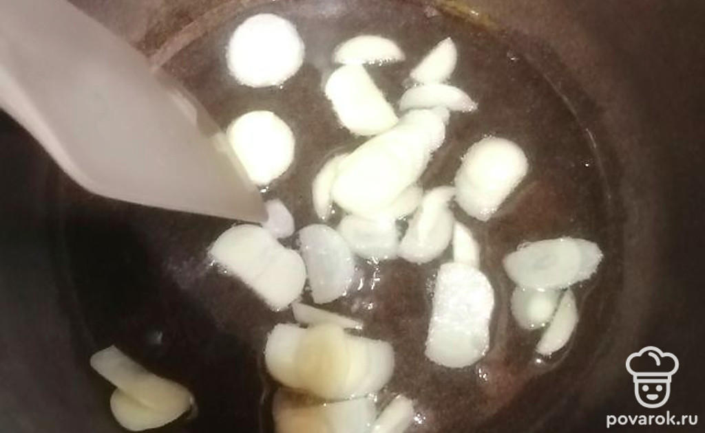 Чеснок режем кружочками и немного обжариваем на растительном масле, чтобы масло пропиталось ароматом чеснока.