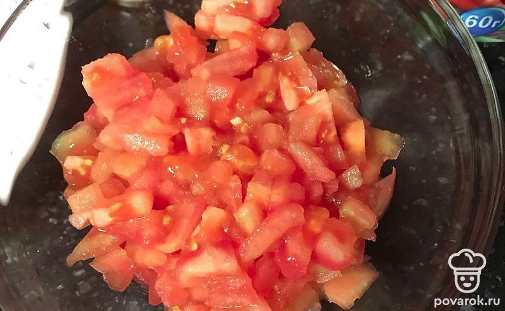 Помидоры очищаем от шкурки и нарезаем кубиками.
