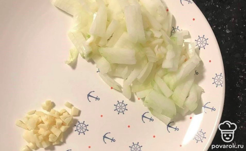 Лук нарежем, чеснок измельчим.