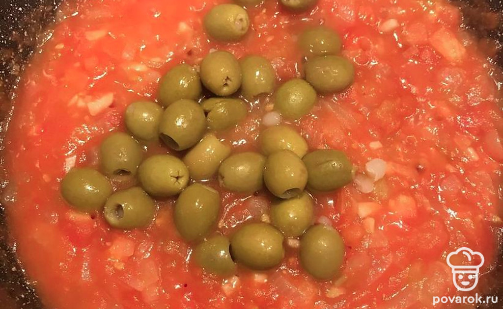 Затем оливки и потушим пару минут, заливаем водой.