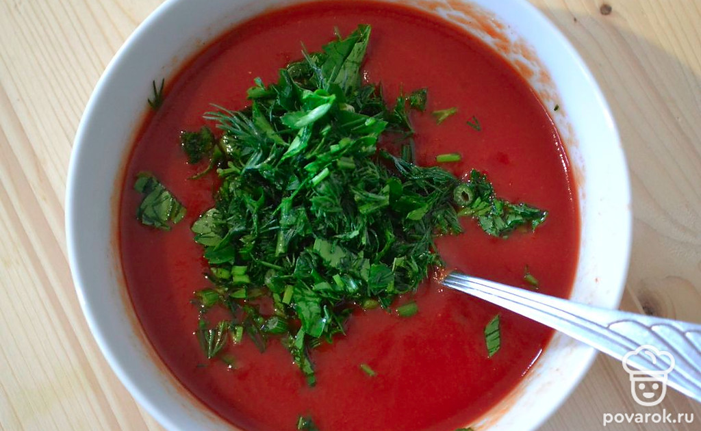 Для соуса в томатную пасту добавляем воду и мелко нарезанные укроп и петрушку. Также добавляем душистый перец горошком. Хорошо перемешиваем.
