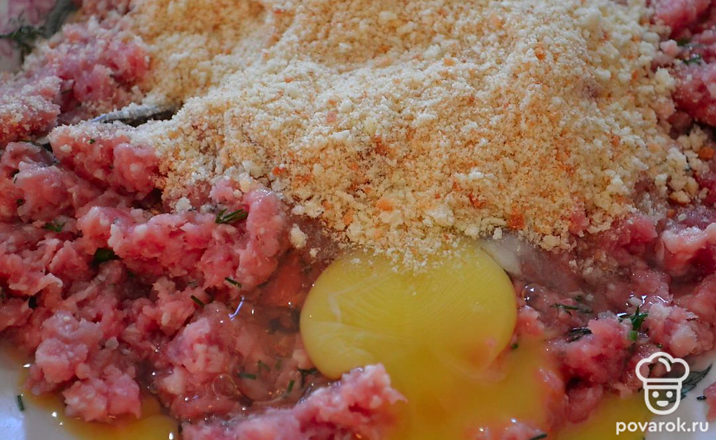Сухари (50 гр), яйцо, и соль добавляем в фарш. Хорошо перемешиваем.